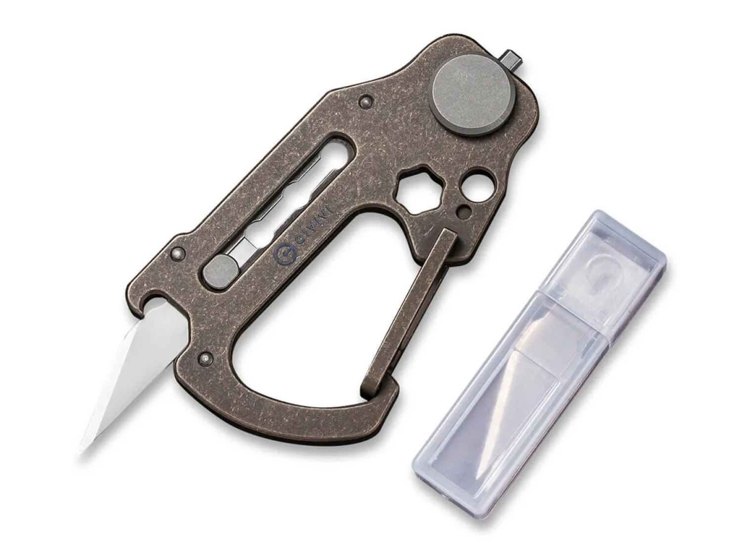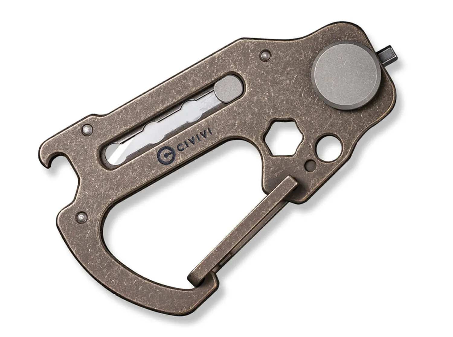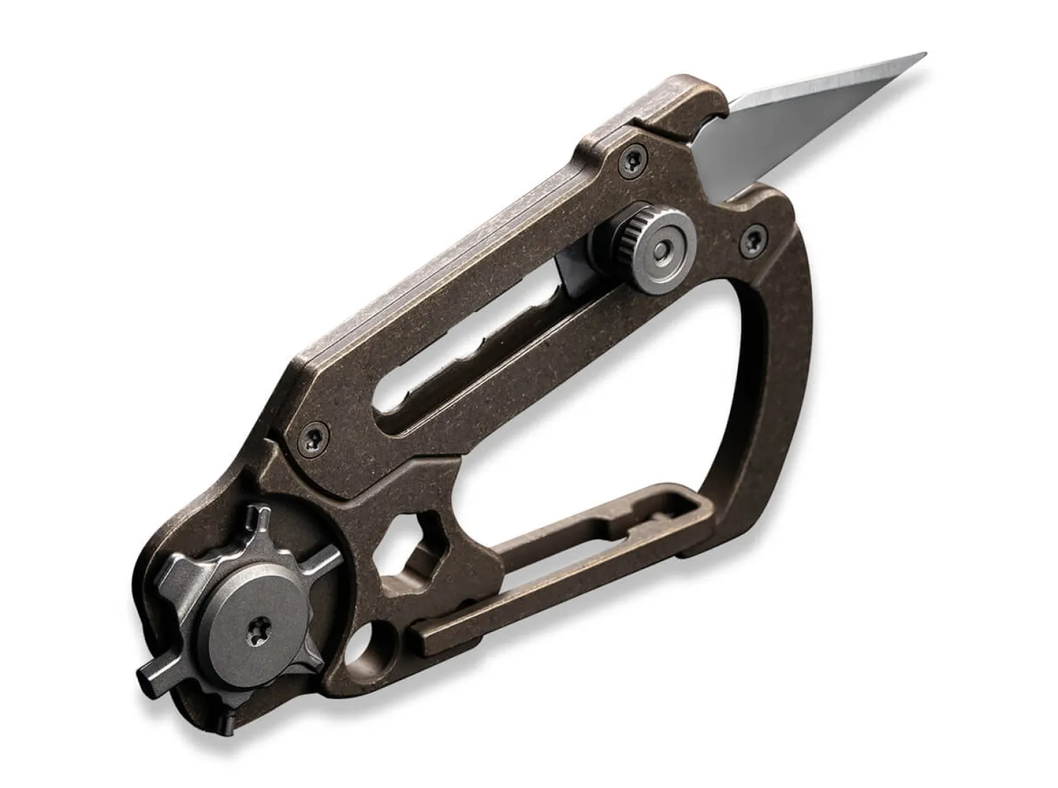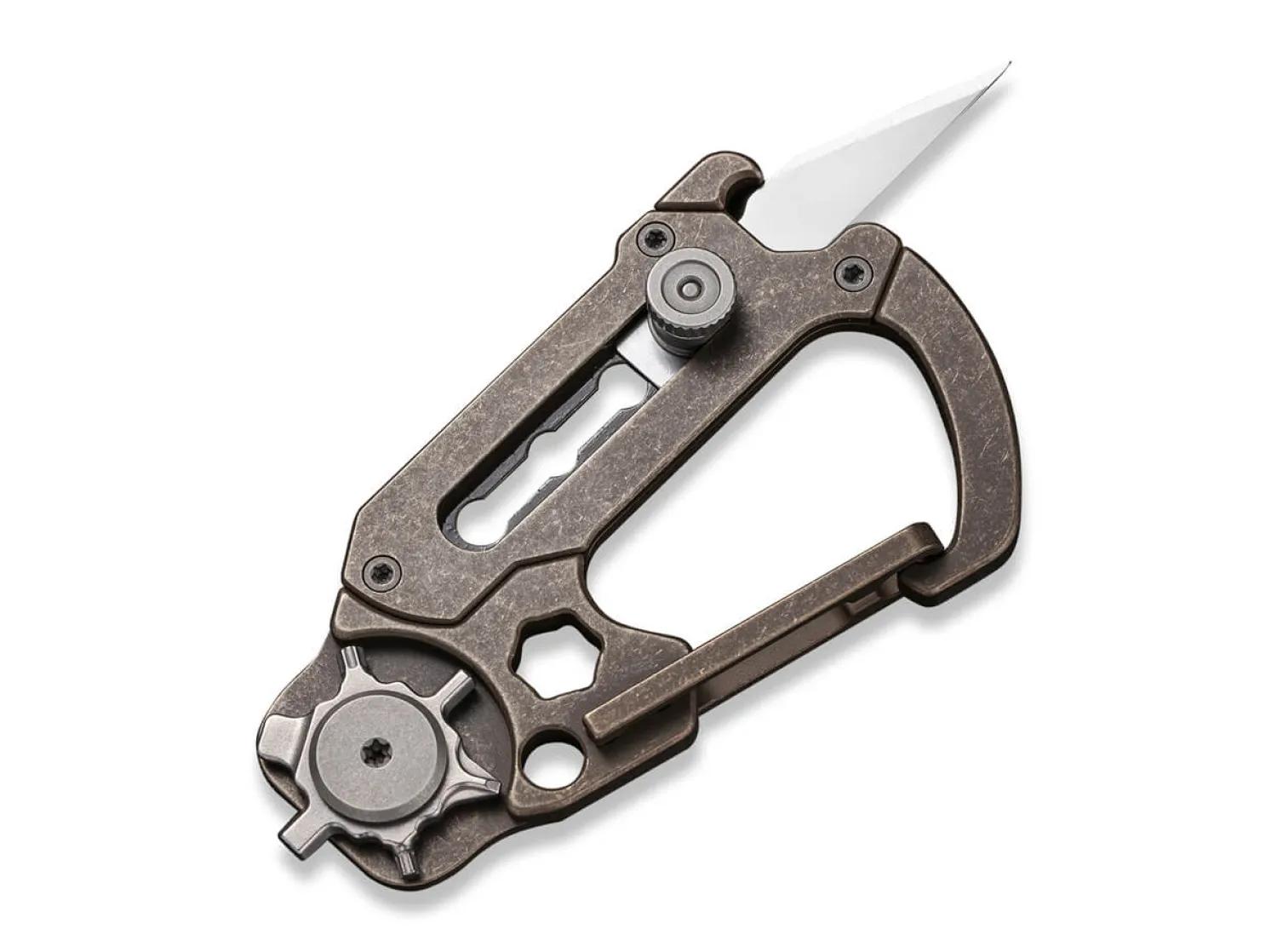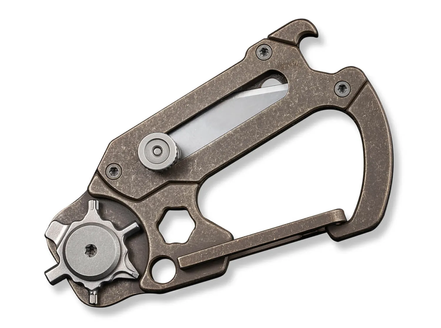 Hier ist der Name Programm. Das vielseitige und kompakte Multitiool hat viele Gesichter und präsentiert sich als praktischer Helfer im Alltag. Seine Konstruktion aus bronzefarbenem Titan enthält einen Karabiner sowie eine herausschiebbare Klinge aus 9Cr18MoV. Das kleine Rad im hinteren Bereich ist u.a. mit Inbus und Torx ausgestattet. Lieferung mit 3 Klingen.