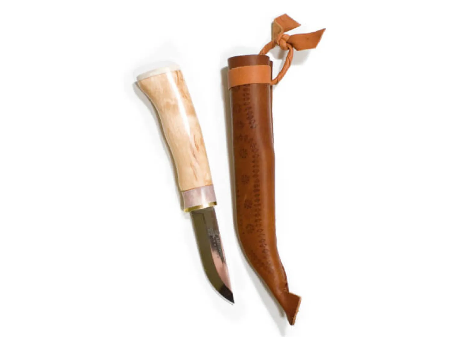 Messergriff aus Maserbirke und Rentierhorn, Klinge 18 x 75 mm aus rostfreiem Sandvik-Stahl 12C27, gehärtet auf 57HRC. Messerscheide aus Rinderleder mit Kunststoffeinlage.