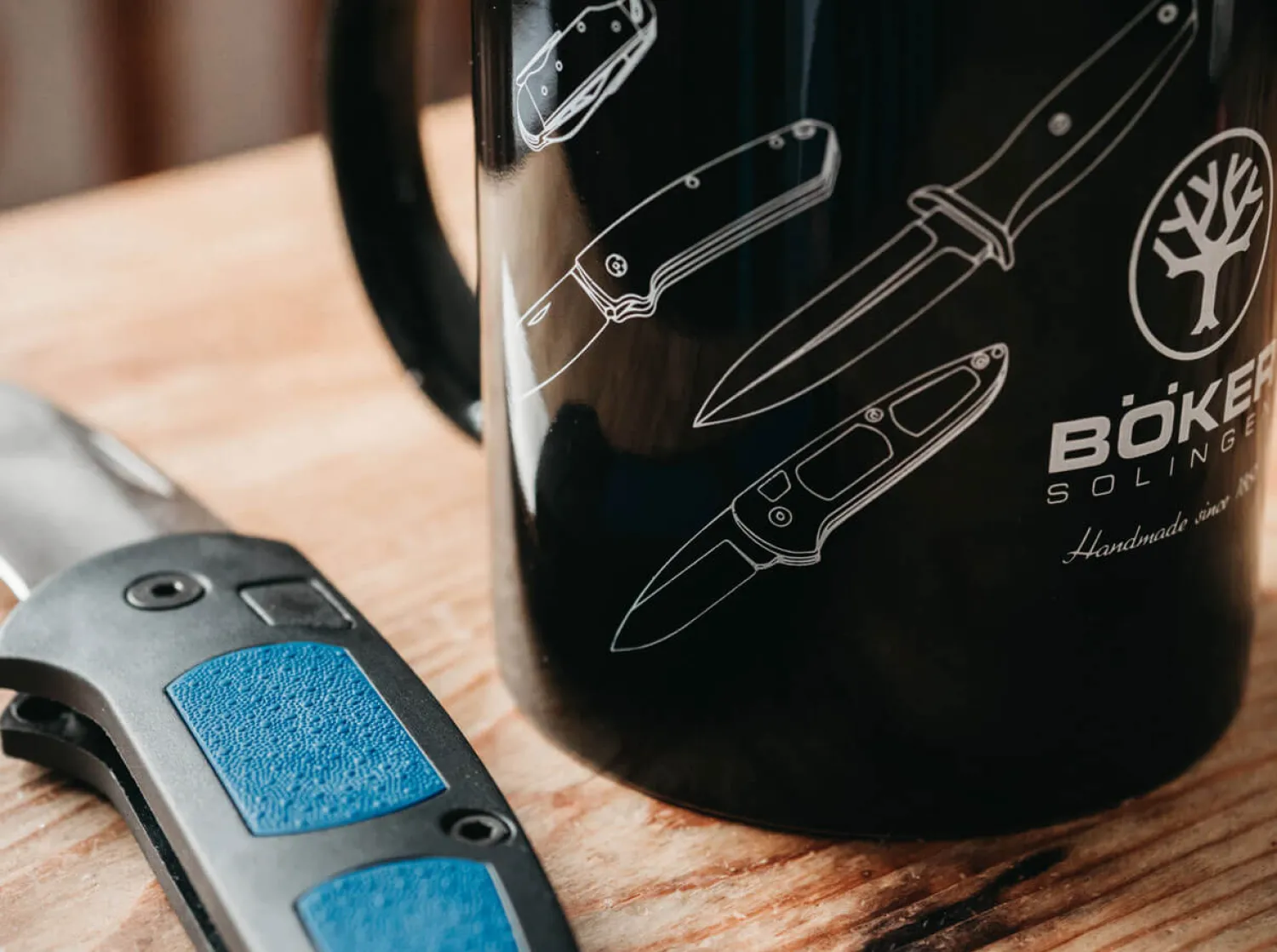 Die hochwertige schwarze Böker Tasse aus Keramik ist ein Muss für jeden Schreib-, Frühstücks- oder Kaffeetisch. Sie fasst 330 Milliliter und ist mit Zeichnungen beliebter Böker Messer versehen.