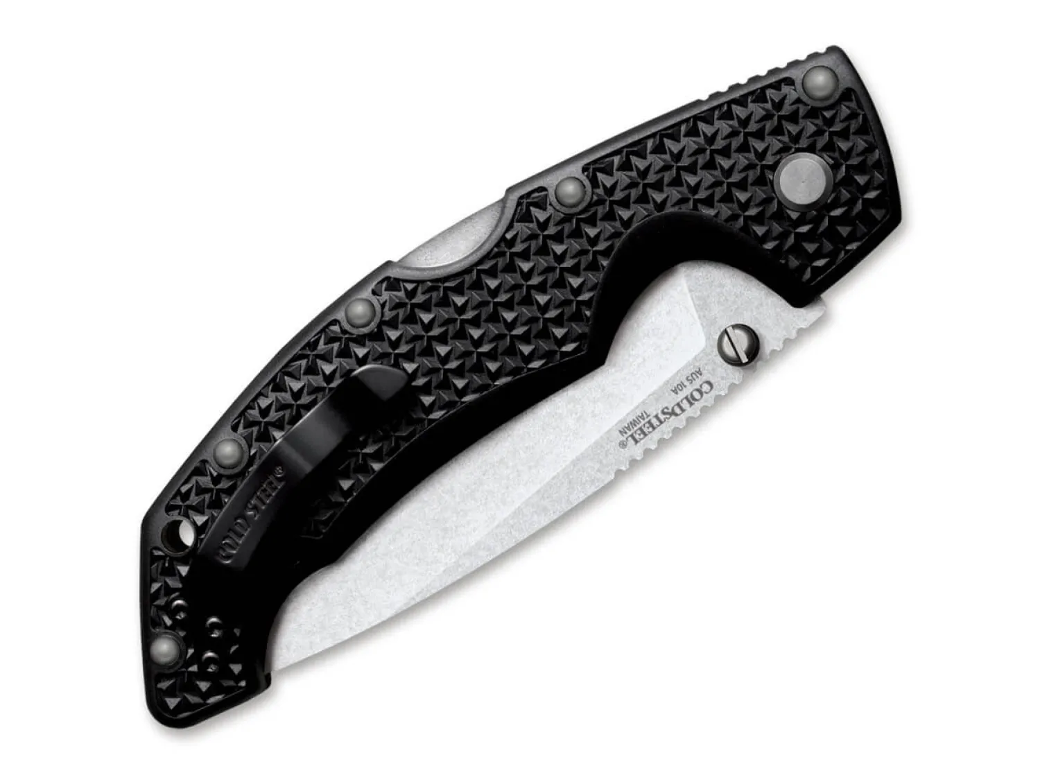 Das Cold Steel Voyager Large versteht sich als ein wahres Messer für jedermann. Leicht, handlich komfortabel und äußerst scharf eignen sich die robusten Messer ideal zum Jagen, Campen oder zum Verrichten von Alltagsarbeiten. Sie sind in Überlebens- und Rettungssituationen hervorragend und erfreuen sich daher auch bei Polizei und Militär großer Beliebtheit. Sie werden in Präzisionsarbeit gefertigt und erfüllen Cold Steels höchste Qualitätsansprüche. Die Droppoint-Klinge aus japanischem AUS 10A-Stahl öffnet per Daumenpin und ist mit Cold Steels zuverlässigen Tri-Ad-Verriegelungsmechanismus ausgestattet. Die ergonomischen Griffe aus Griv-Ex sind mit Platinen aus gehärtetem Aluminium verstärkt und sorgen selbst bei ausgedehntem Gebrauch unter härtesten Bedingungen für hohen Komfort und sicheren Halt. Mit umsetzbarem Tip-Up Clip und Fangriemenöse.