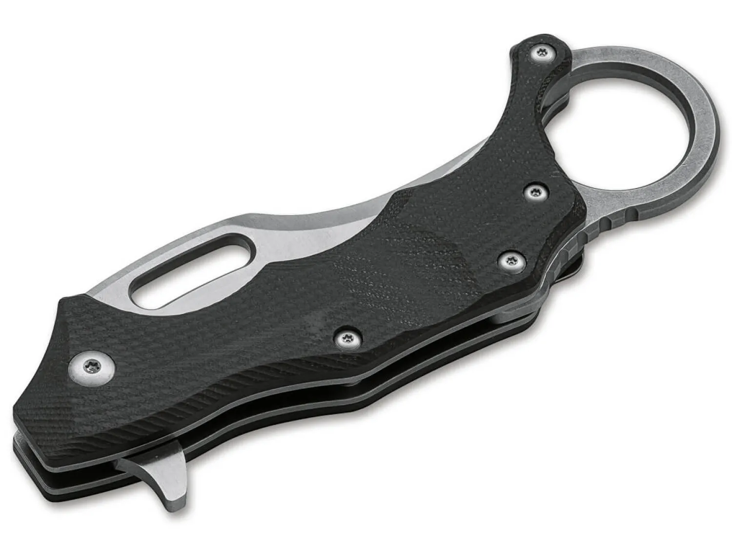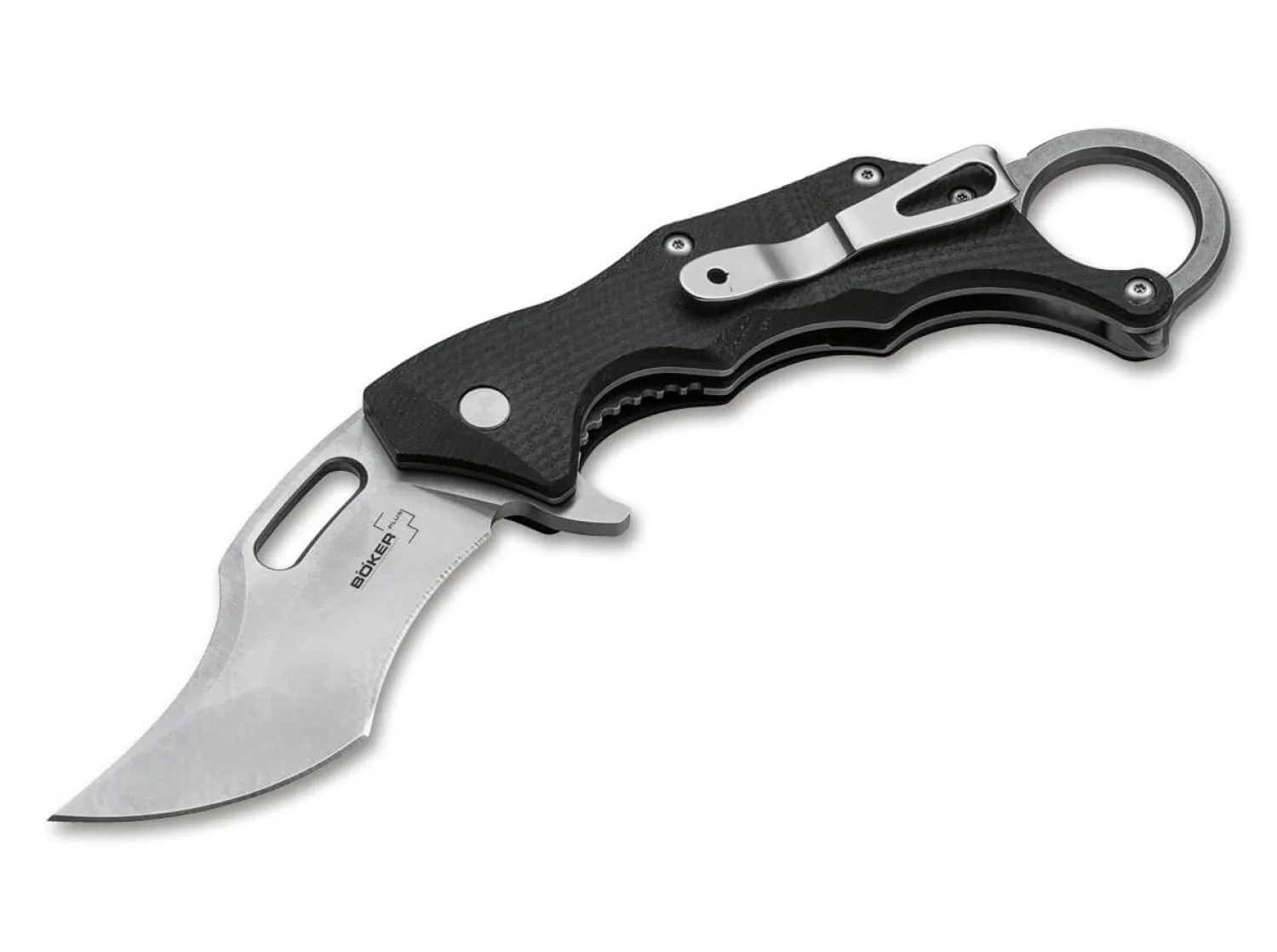 Die Entwürfe von Boris Manasherov überzeugen durchgehend durch ihre hohe Durchdachtheit, die perfekte Ergonomie und das ausdrucksstarke Design. Das überaus erfolgreiche Böker Plus Wildcat bekommt mit dem Wildcat XL einen großen Bruder zur Seite gestellt, der mit den gleichen Vorzügen punktet wie das Original, aber mit noch etwas mehr Handfestigkeit überzeugt. Für die kugelgelagerte Klinge kommt auch hier D2 zum Einsatz, während die Beschalung aus G10 besteht. Die Verriegelung erfolgt per Linerlock. Das Kerambit überzeugt mit perfekter Handlage, und die Klinge öffnet wahlweise weich per Daumenloch, oder schnell und nachdrücklich per Flipper. Der umsetzbare Clip (l/r) sorgt für einen tiefen Sitz in der Tasche, der den Ring jedoch oberhalb des Taschensaumes für ein schnelles Ziehen zugänglich lässt.